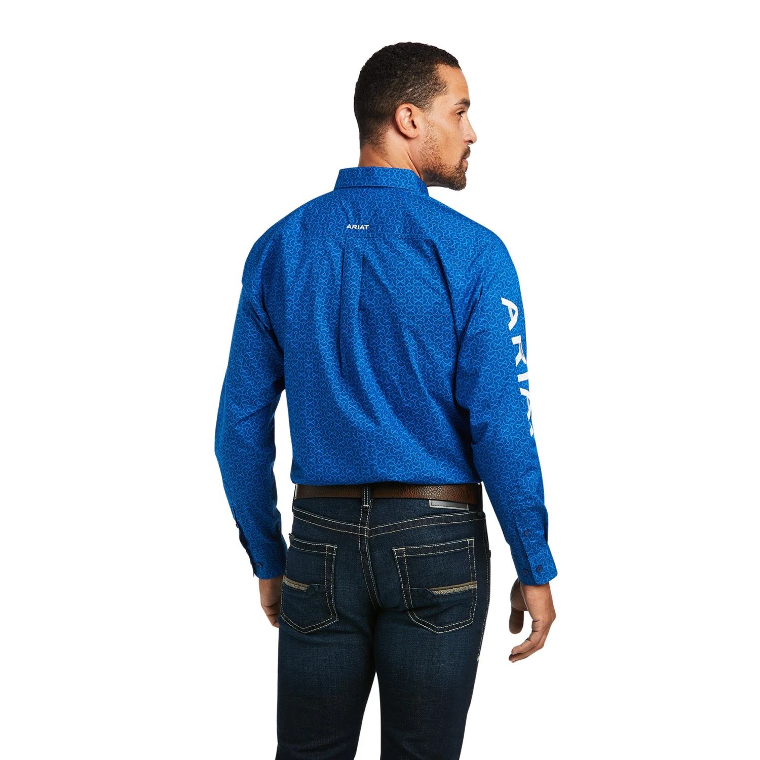 Blue Print Long Sleeve Button Down Shirt with White Logo Embroidery.