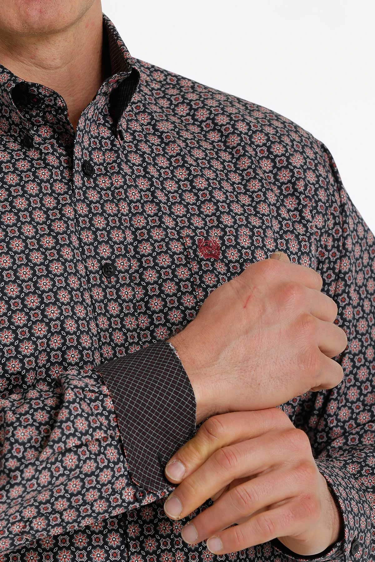Black, White and Red Medallion Print Long Sleeve Button Down Shirt.