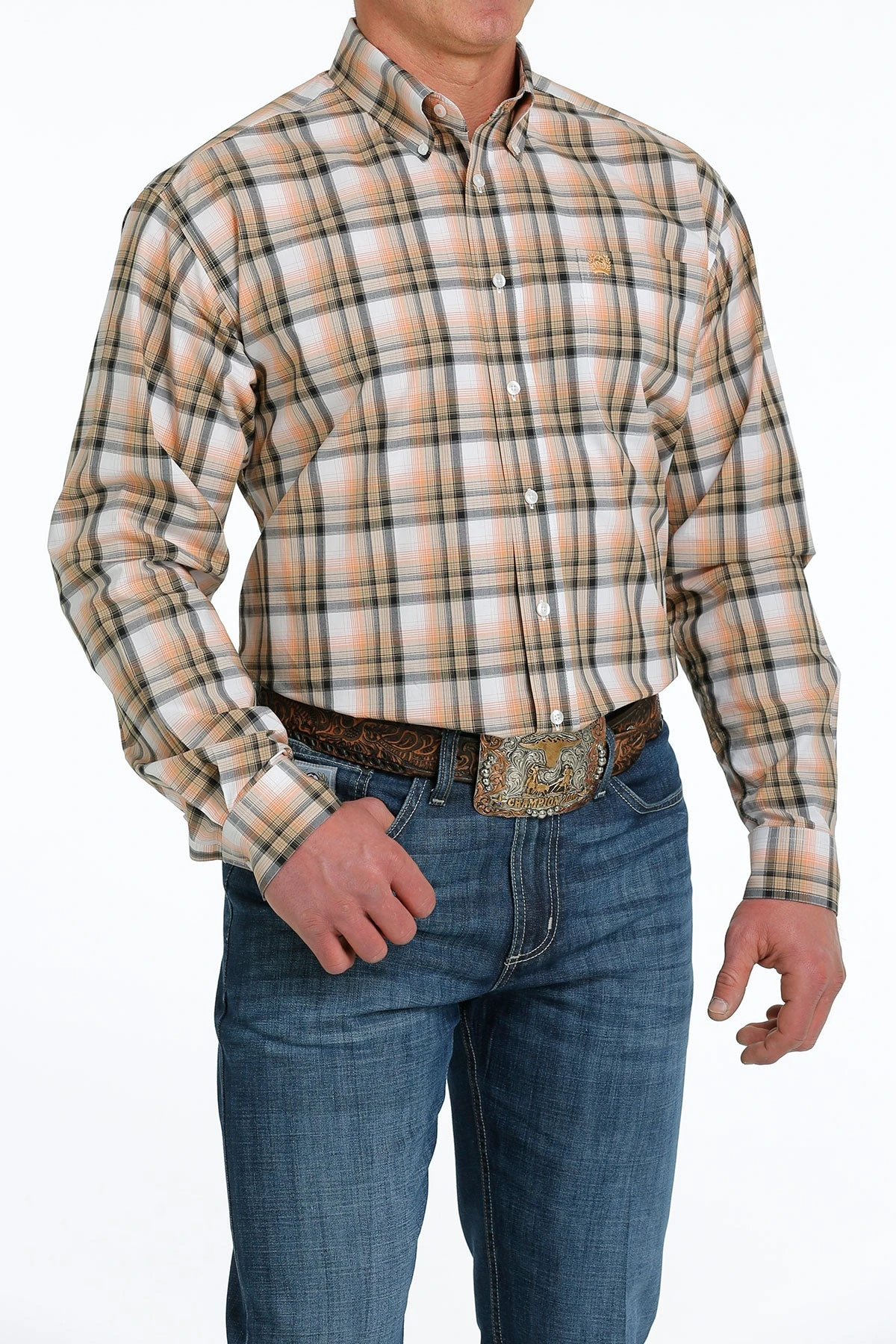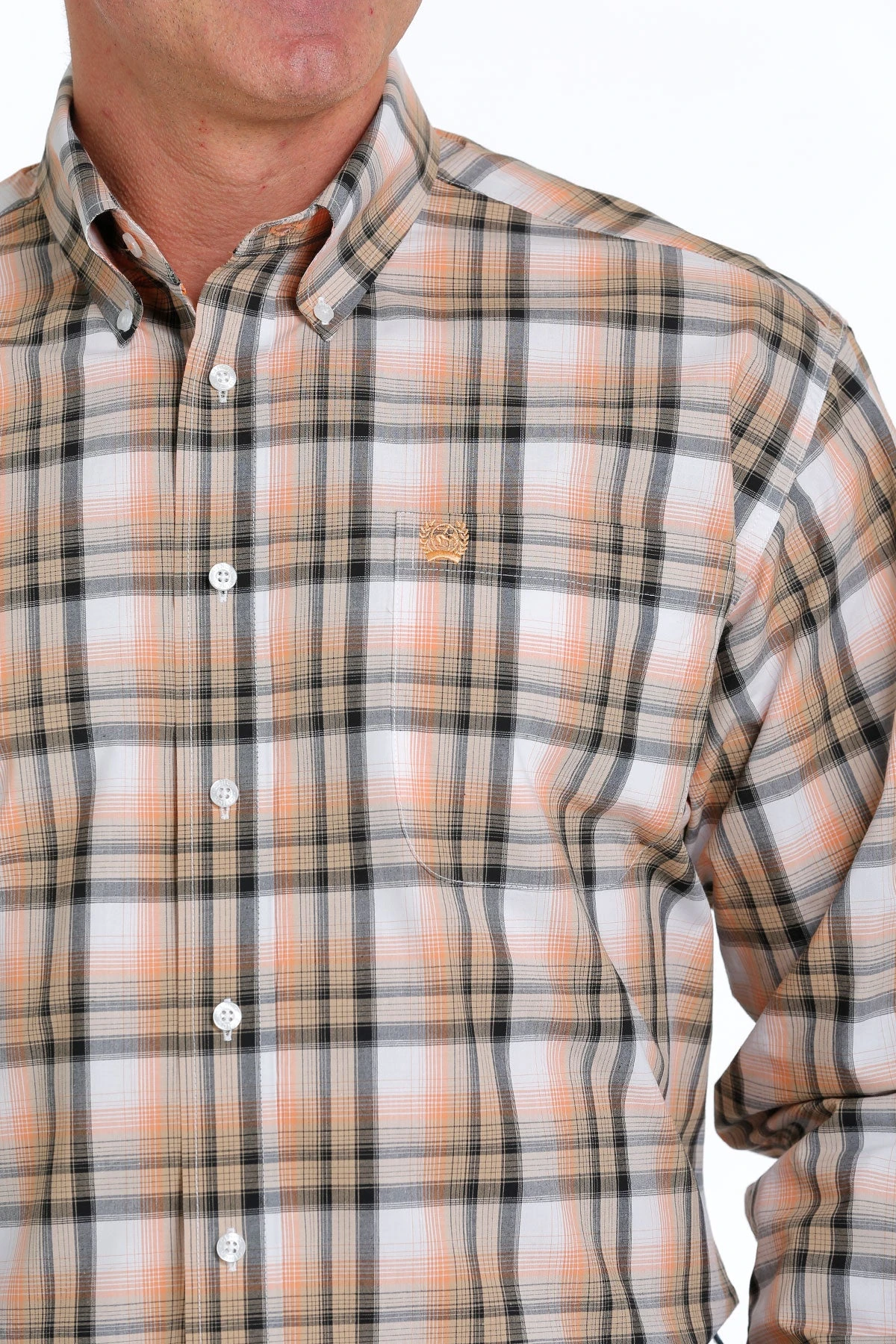White, Orange and Khaki Plaid Long Sleeve Button Down Shirt.