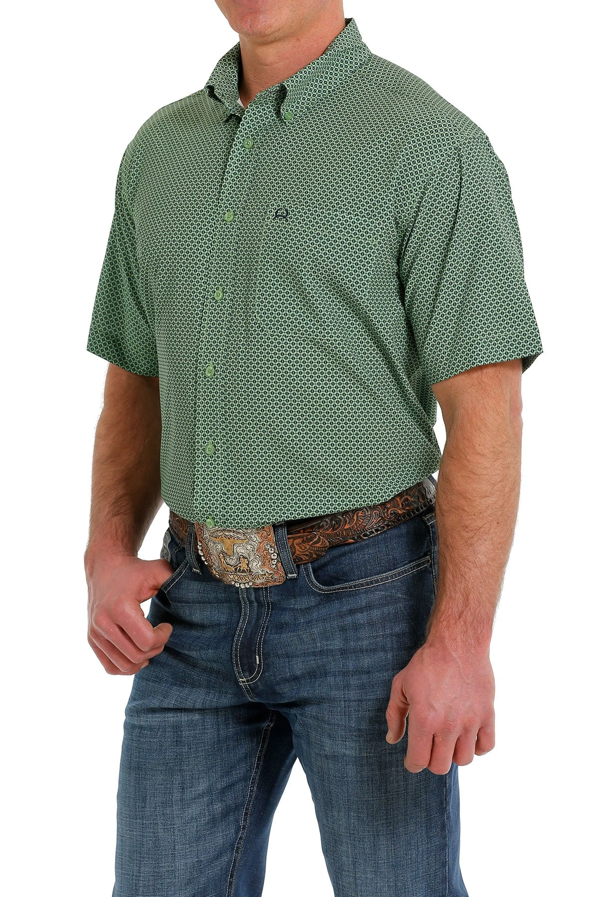 Green and Dark Green Print Short Sleeve Button Down Shirt.