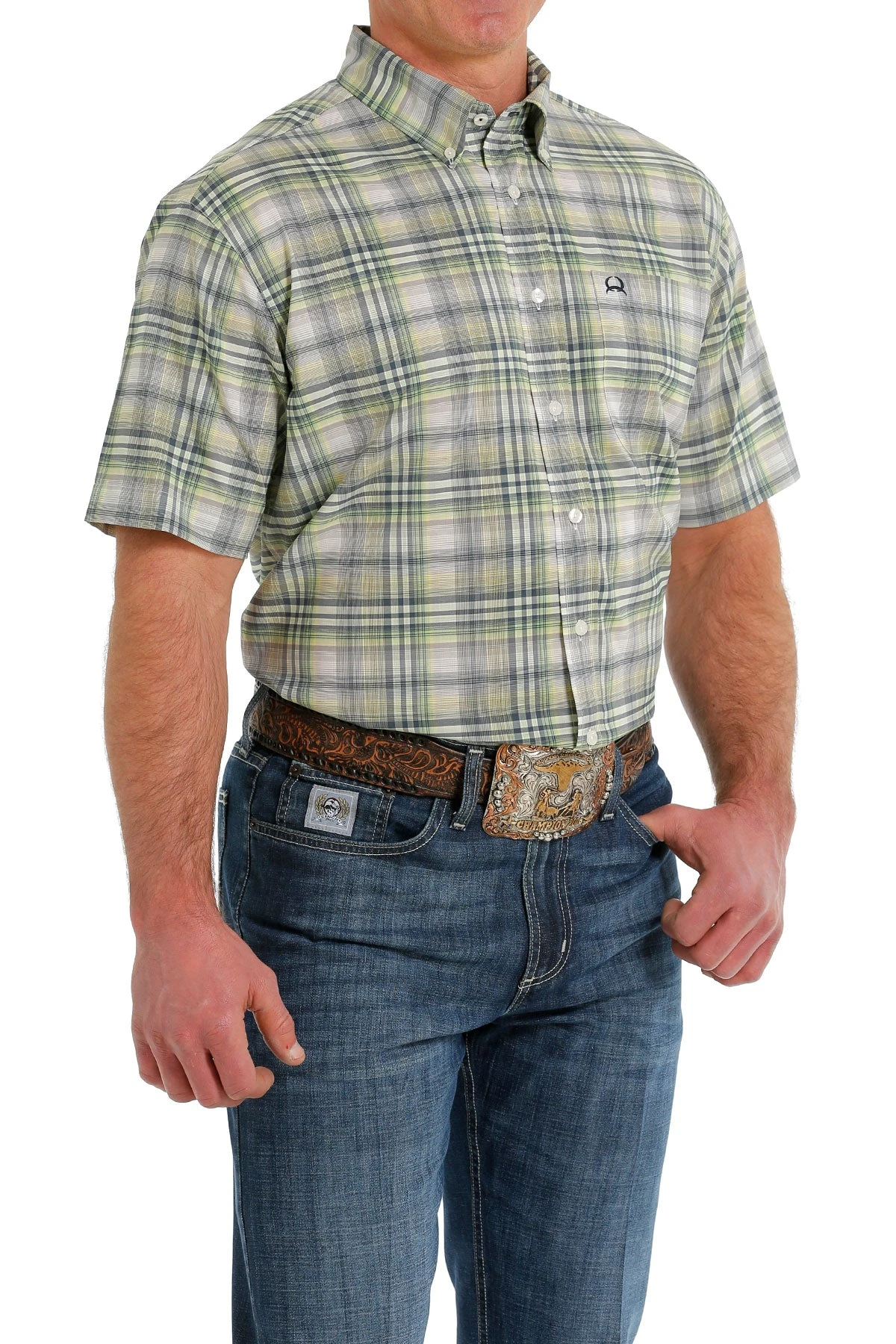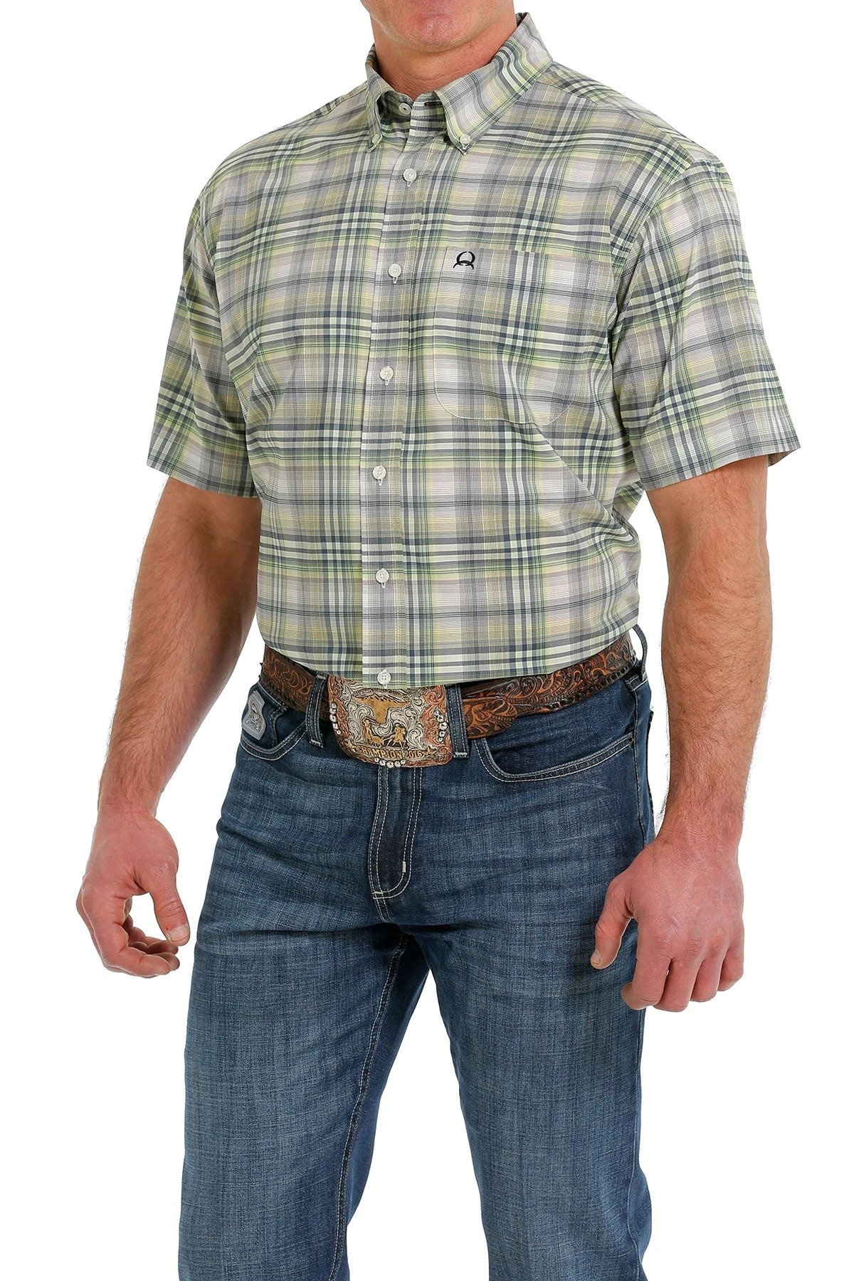 Grey, Yellow and Green Plaid Short Sleeve Button Down Shirt.
