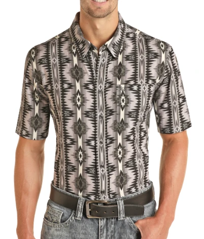 Charcoal Aztec Print Short Sleeve Button Down Shirt.