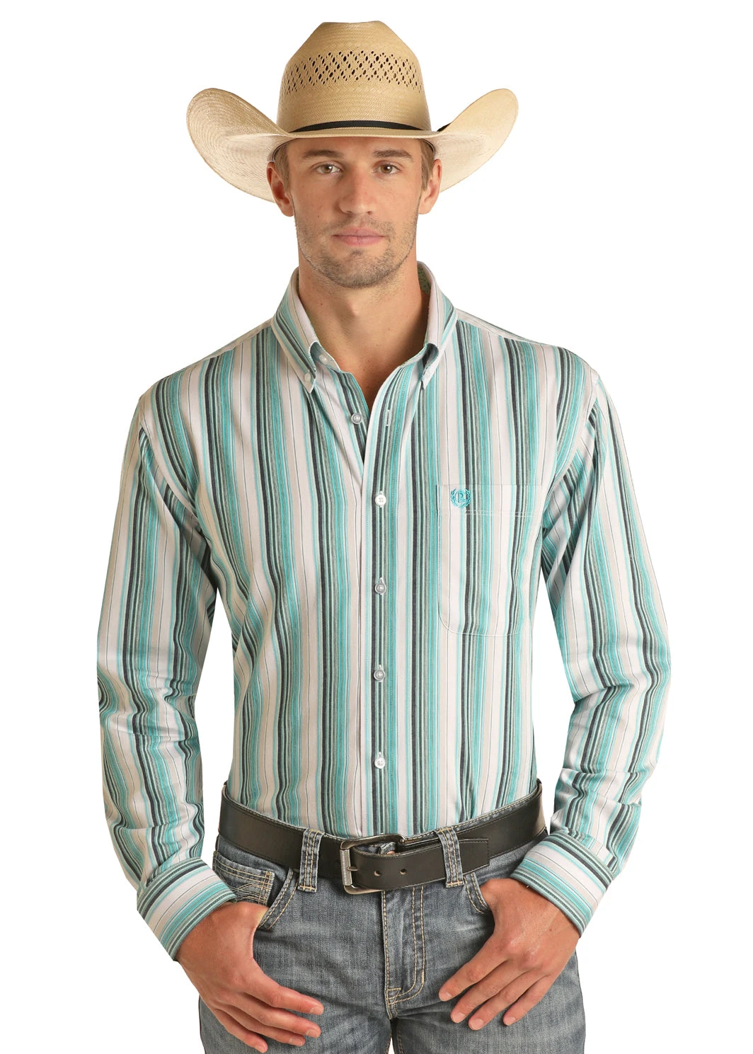 Turquoise and White Serape Print Long Sleeve Button Down Shirt.