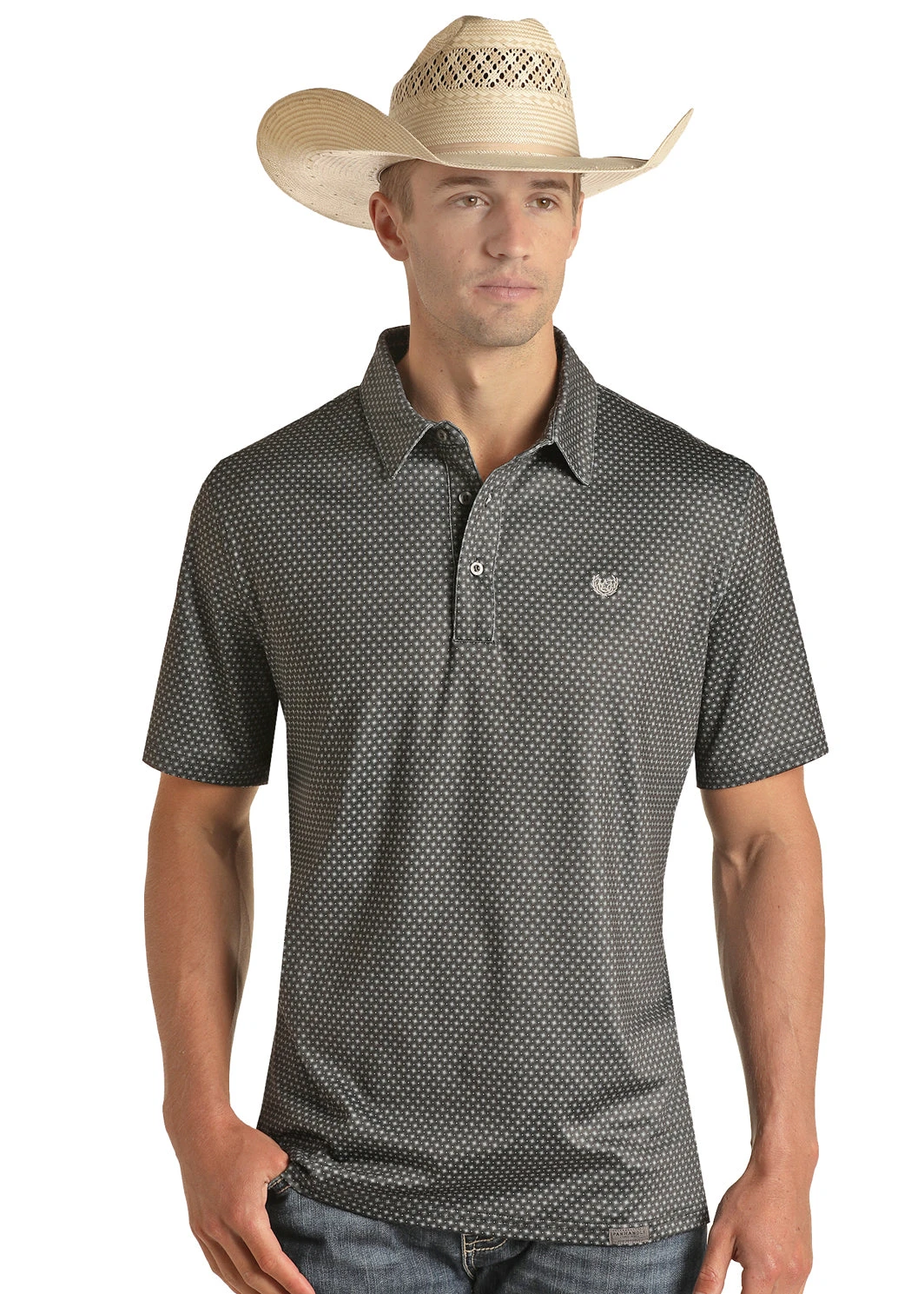 Grey and Blue Geometric Print Short Sleeve Polo.