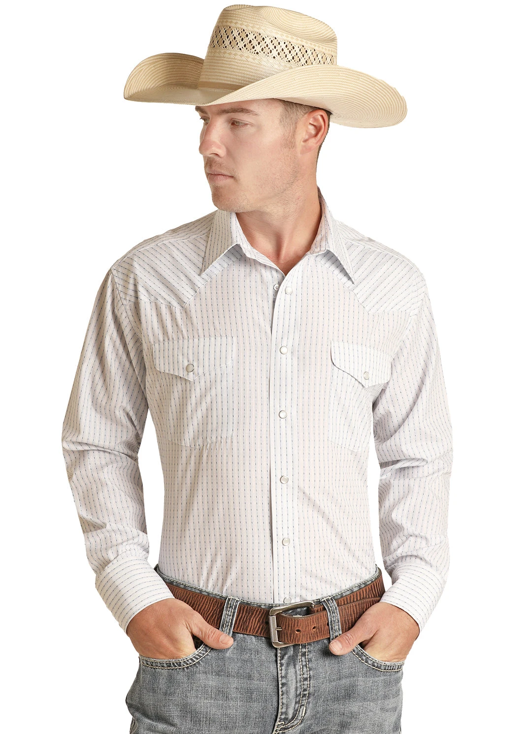 White with Blue Stripe Satin Dobby Long Sleeve Snap Front Shirt.