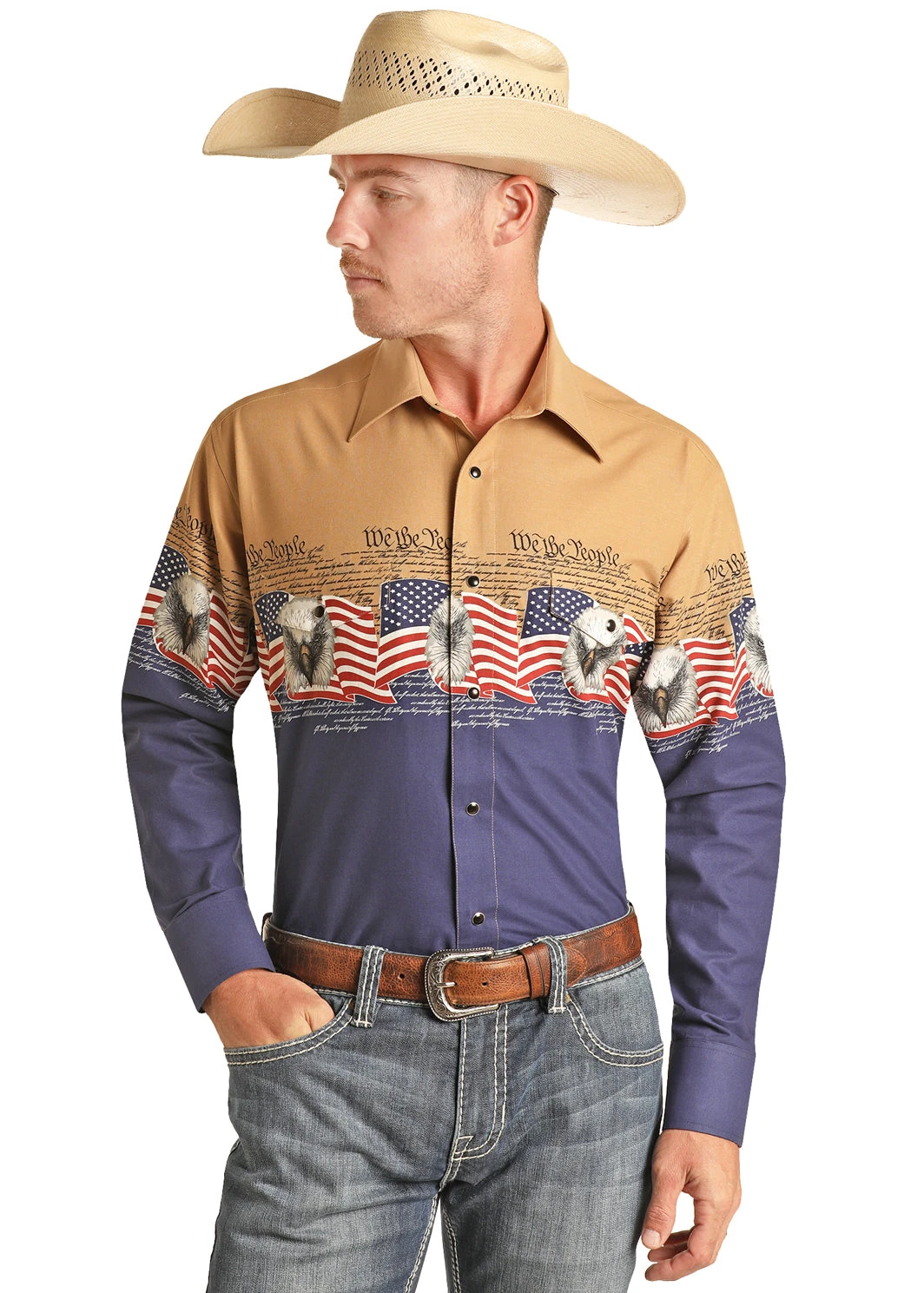 Navy and Tan with “We The People” Eagle and Flag Border Print Long Sleeve Snap Front Shirt.