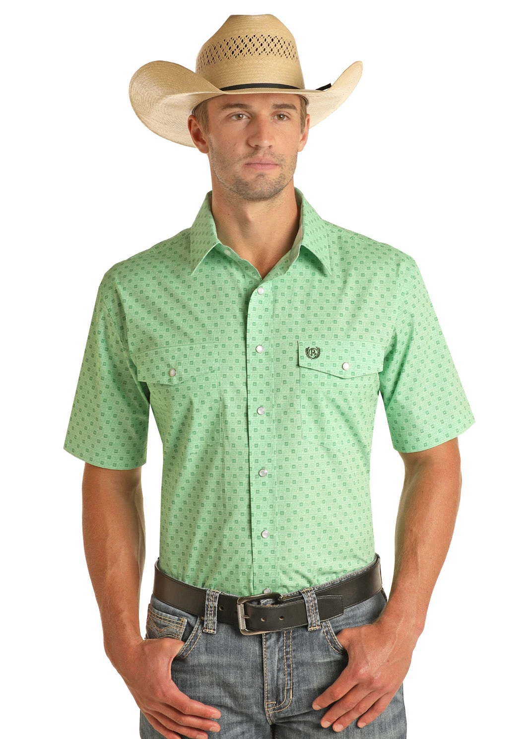 Light Green and Dark Green Square Print Short Sleeve Snap Front Shirt.