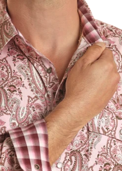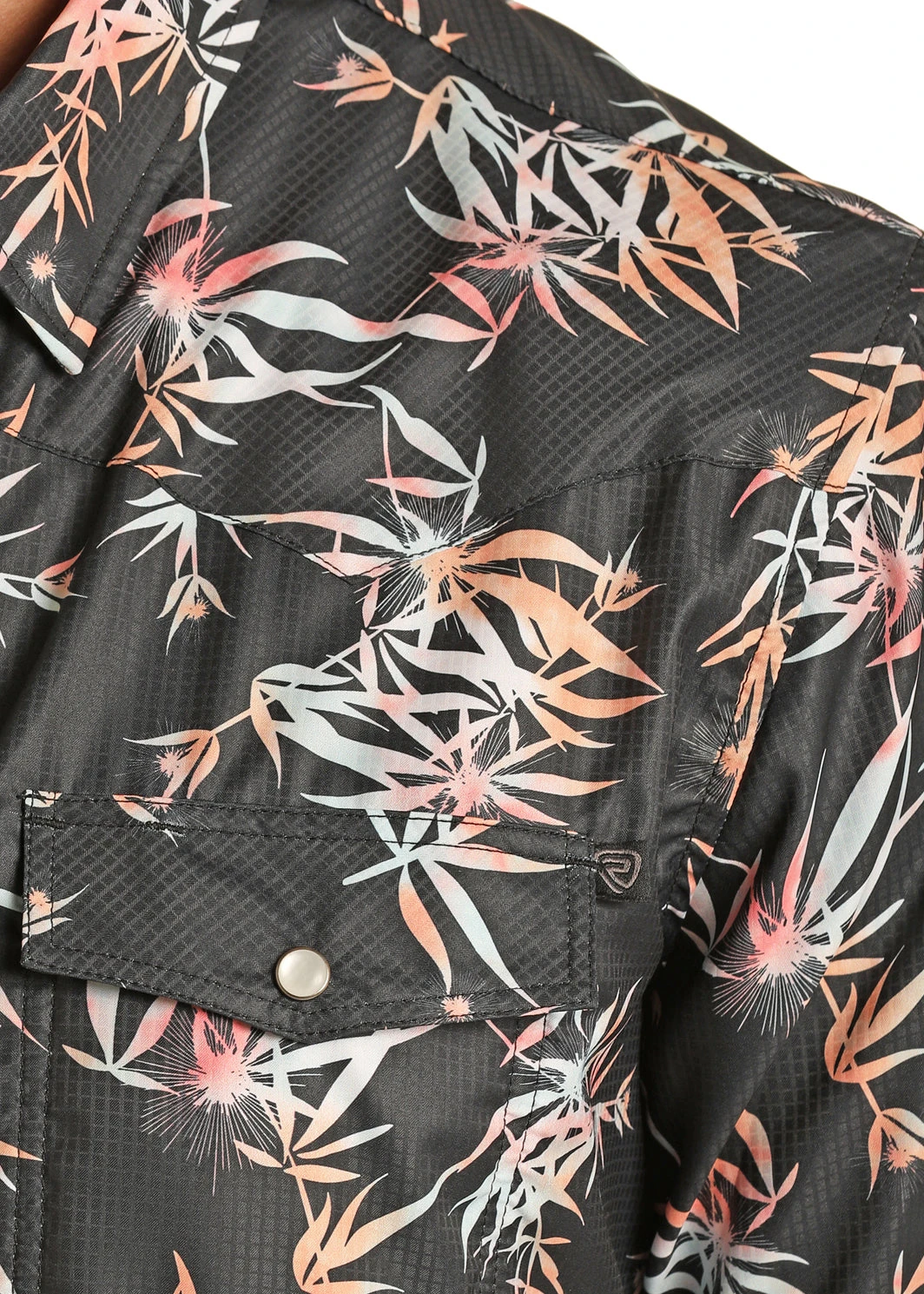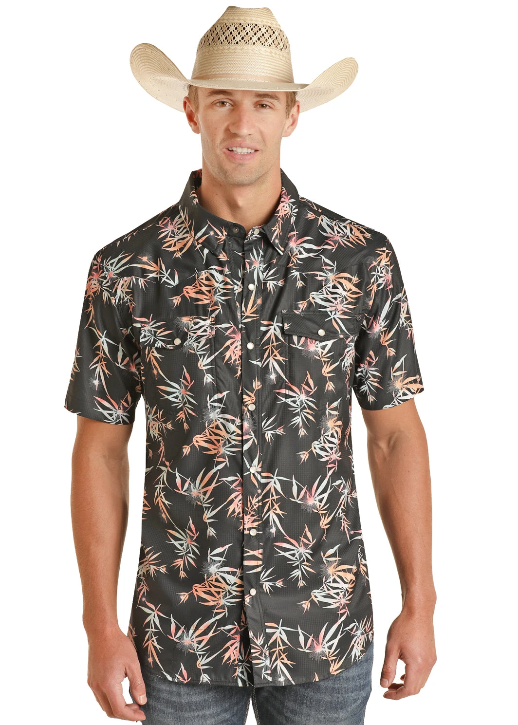 Black with Tropical Print Short Sleeve Ripstop Snap Front Shirt.