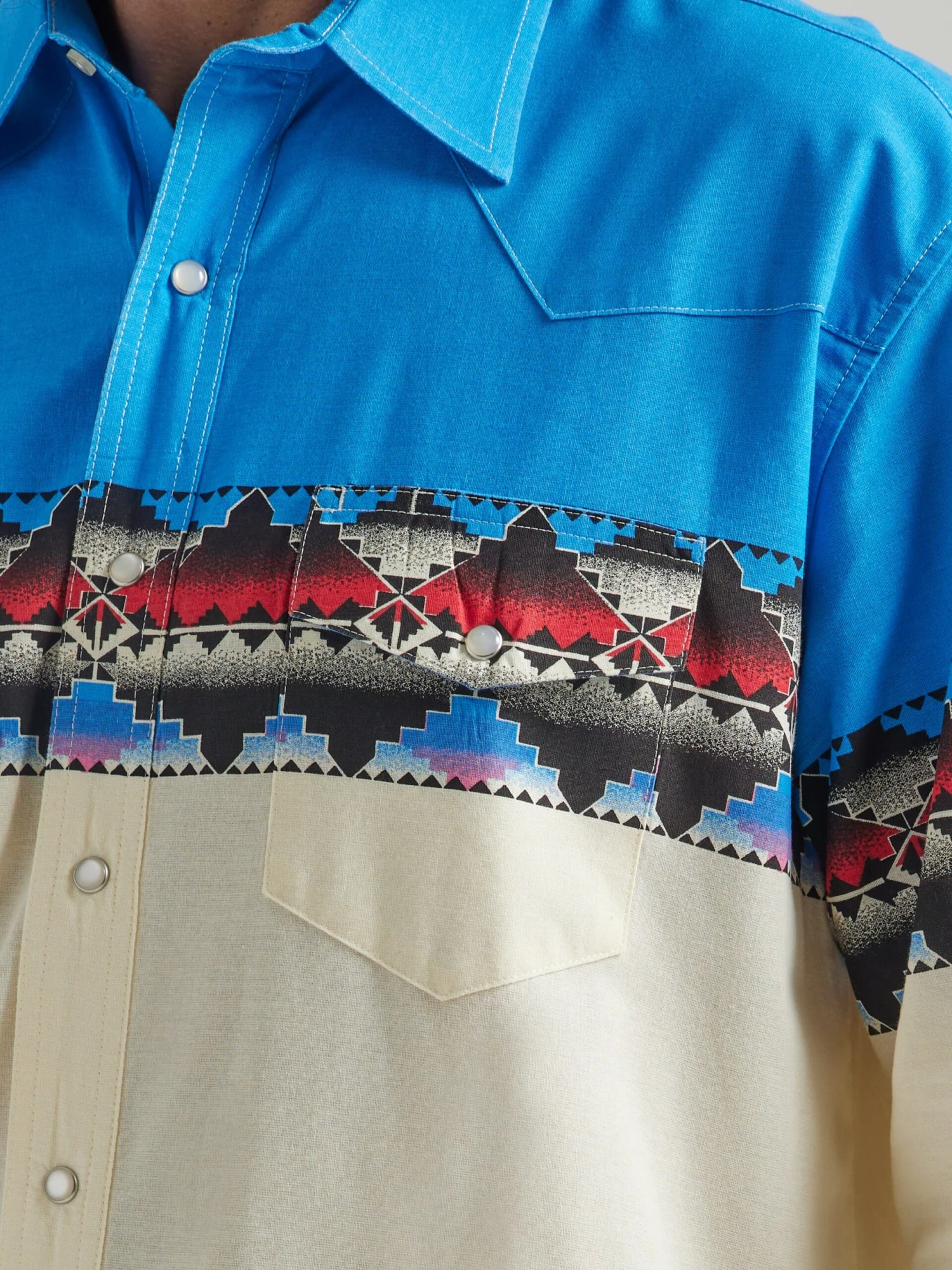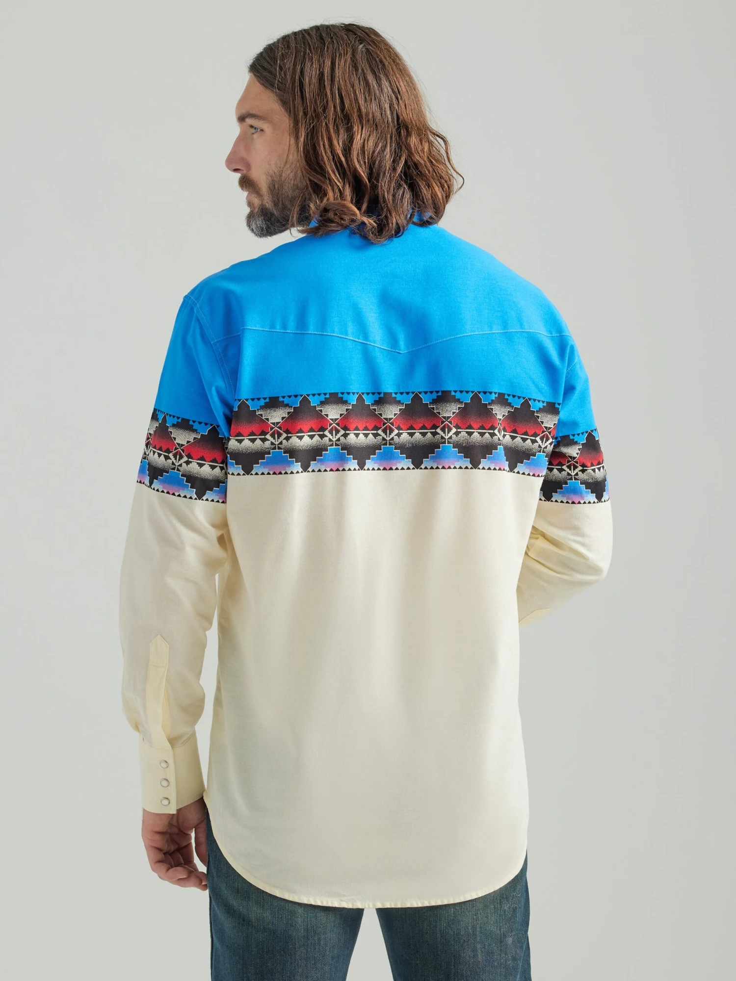 Blue and White with Red and Black Aztec Border Print Long Sleeve Snap Front Shirt.
