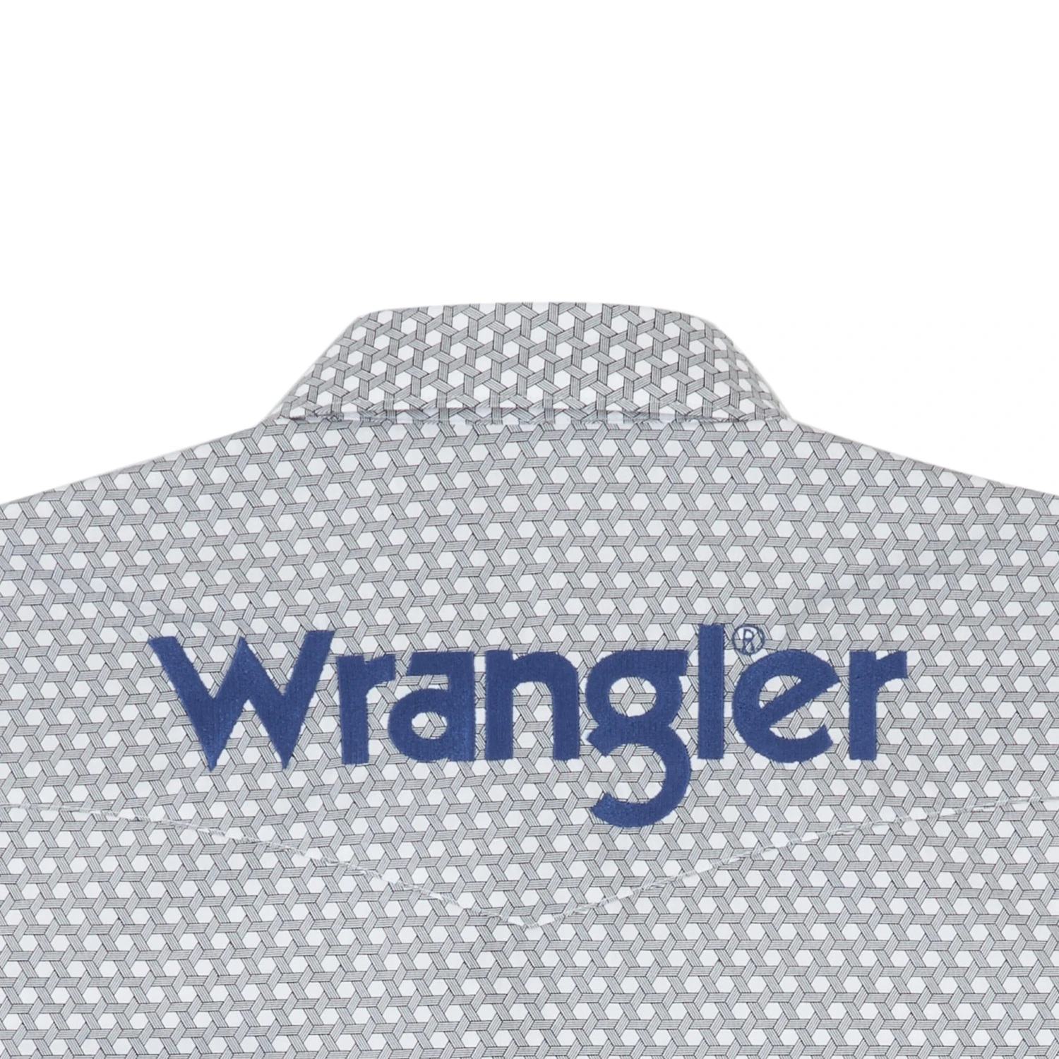Blue and White Circle Pattern Long Sleeve Snap Front Logo Shirt.