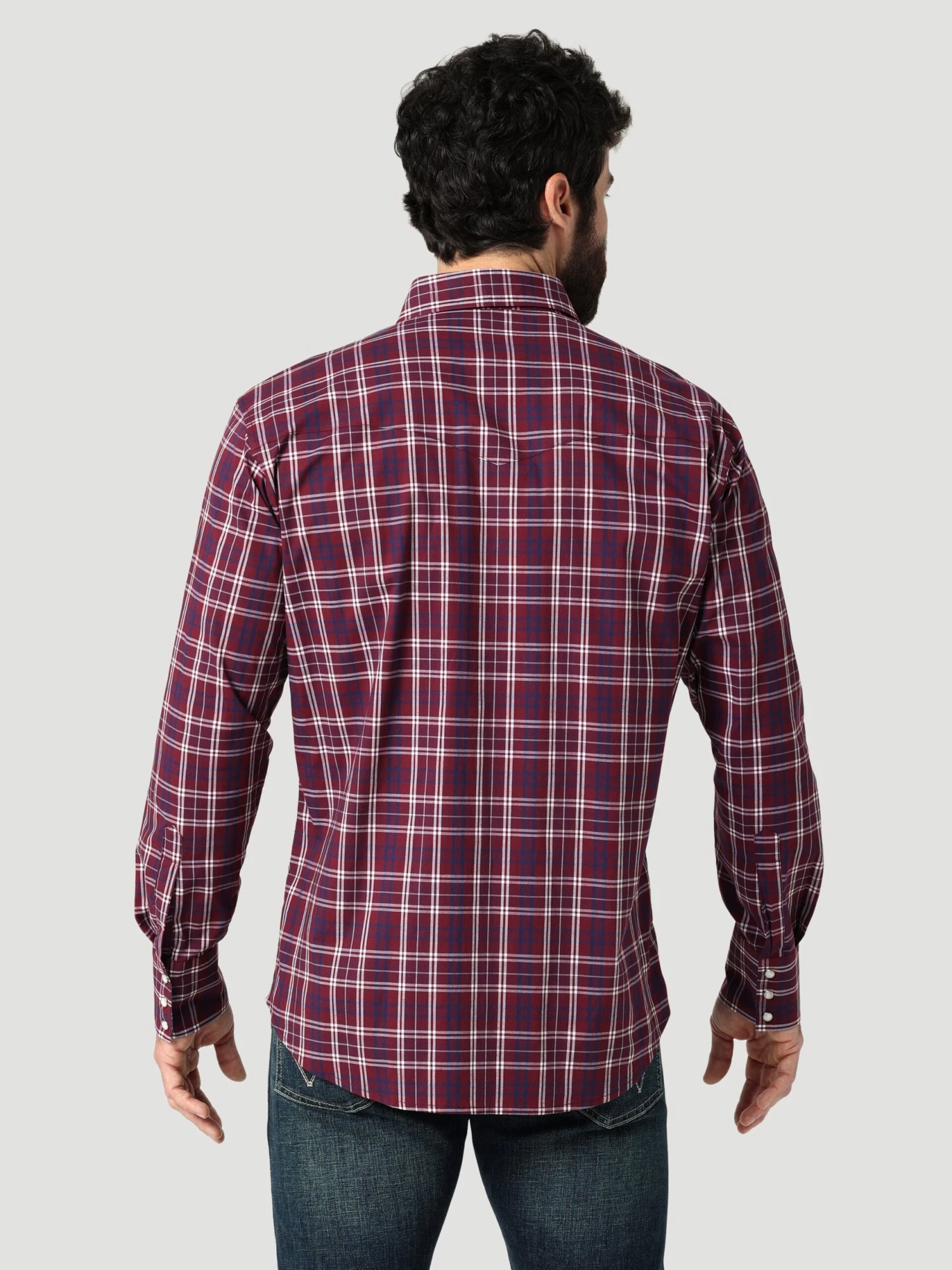 Burgundy Plaid Long Sleeve Wrinkle Resist Relaxed Fit Snap Front Shirt.