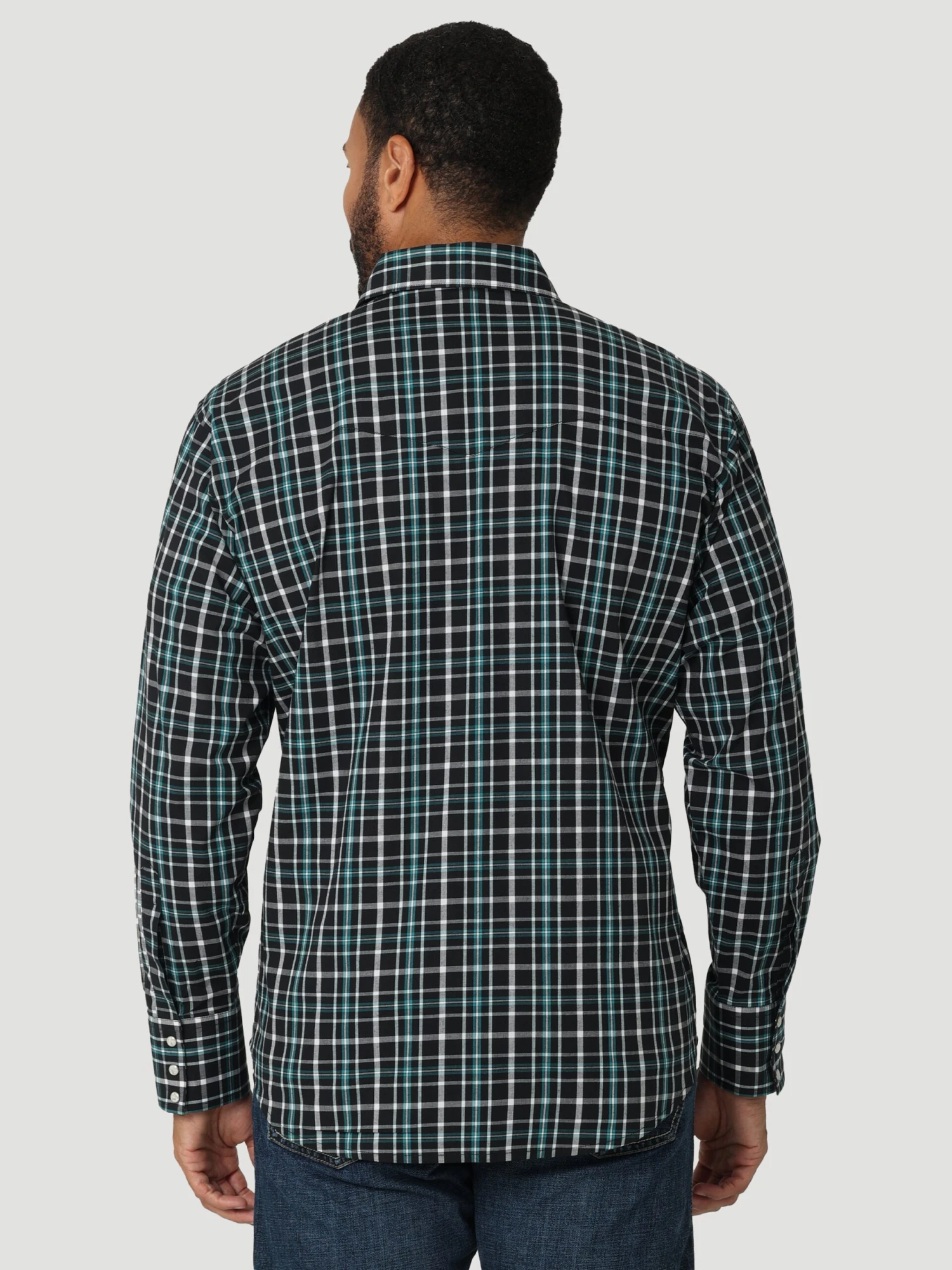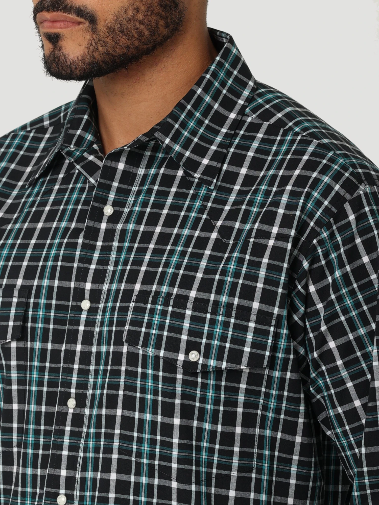 Black and Dark Teal Plaid Long Sleeve Wrinkle Resist Relaxed Fit Snap Front Shirt.