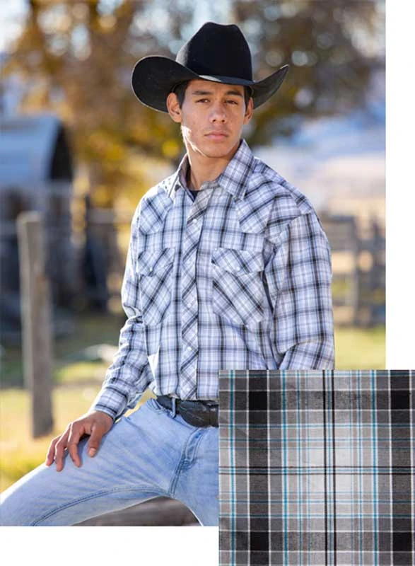 Silver Grey and Black Plaid Long Sleeve Snap Front Shirt.